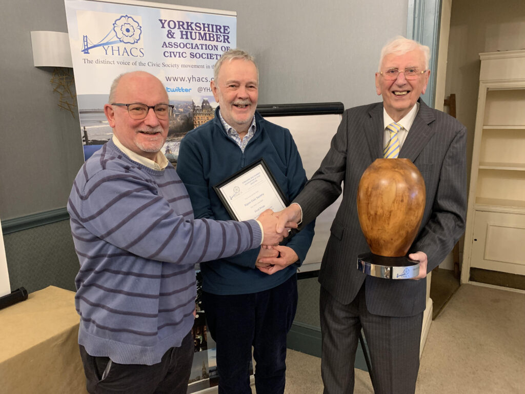The annual YHACS/Peter Spawforth Award was won by Ripon Civic Society in recognition of its two-year campaign to stop Ripon Cathedral building on a much-loved park in the heart of the city. Society Co Chairs Richard Taylor and David Winpenny are pictured receiving the trophy, certificate and £200 cheque from Peter Spawforth.